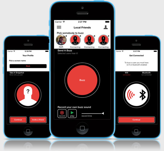 Need to get somebody's attention? Want to alert a colleague? A bit bored at work or school, want to annoy your friend or make them laugh? Buzzcom makes it easy to send audio and vibration alerts to friends, colleagues and even complete strangers. Once connected with the press of a button you can make the other users device vibrate and play a sound, you can even record your own sound bite.. the possibilities are endless. Best of all there's no need for a 3G connection and costly 3G bills as the connection is made via bluetooth or wi-fi*