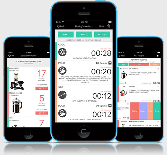 The app connects to a database of recipes that is regularly updated, meaning the list of coffee brews is ever growing. The built in timer allows you to see the upcoming steps in the brew process and will auto adjust to support every recipe featured in the app, even the new ones. With support for multiple brew procceses including, V60, Aeropress and French press no matter what coffee you like you'll find recipes for it. Plus with our update system new brew types can be added so if its not available, watch this space. And all this for less than a bag of coffee beans... Happy brewing.